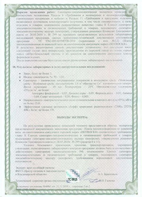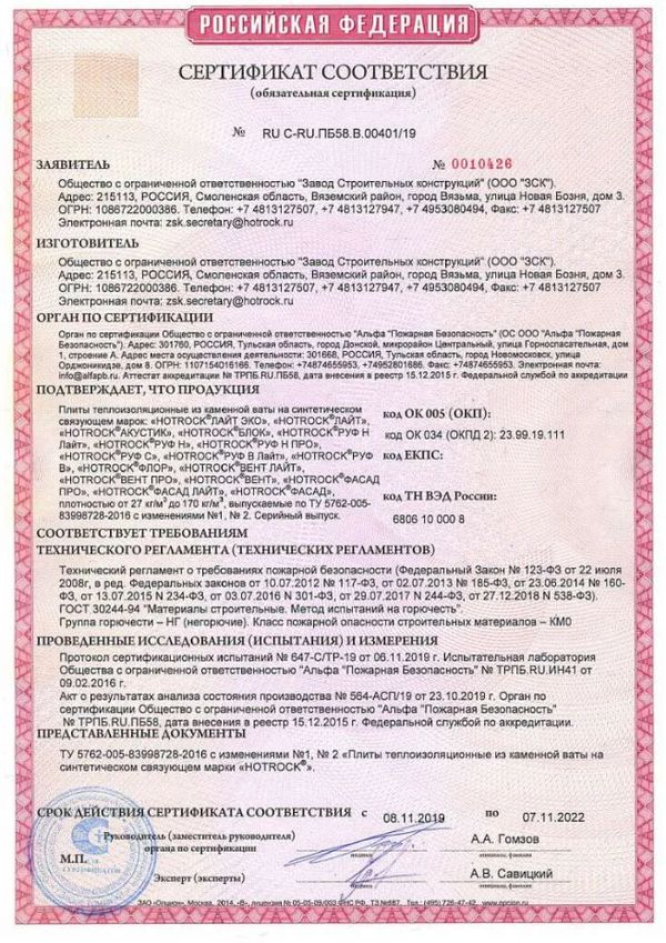 Группа горючести данного материала - НГ (негорючий), что делает его безопасным в использовании. Базальтовая вата Hotrock Фасад 110х600х1200 не поддерживает горение и не выделяет вредных веществ при нагреве.